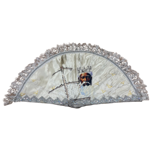 Este hermoso abanico ceremonial de 65 x 35 cm está confeccionado con tela satinada de alta calidad, impresa a todo color con la imagen sagrada de Obatalá, el Orisha mayor de la creación, la pureza, la sabiduría y la paz interior.
