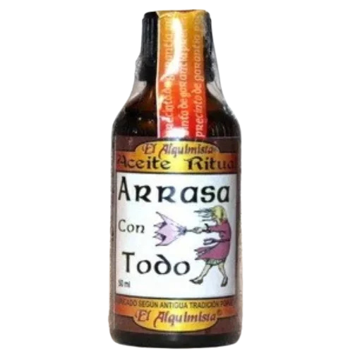 El Aceite Arrasa con Todo es un potente preparado de limpieza y descarga energética, utilizado para realizar un verdadero «borrón y cuenta nueva» en cualquier aspecto de la vida. Su energía es agresiva contra la negatividad, capaz de destruir y frenar cualquier maleficio, brujería, hechizo, mal de ojo, o cualquier tipo de bloqueo que impida el avance personal, económico o amoroso.