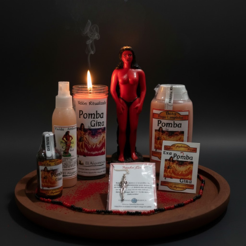 El KIT RITUAL COMPLETO POMBA GIRA está diseñado para invocar y honrar a la entidad femenina Pomba Gira, Reina de las Encrucijadas, asociada con el Amor Irresistible, el Deseo, la Seducción, el Empoderamiento y la Justicia Emocional en las tradiciones afrobrasileñas (Umbanda y Quimbanda).