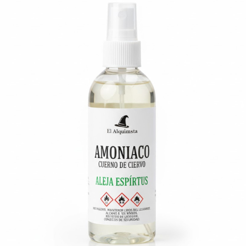 Amoníaco Cuerno de Ciervo – Aleja Espíritus” Frasco 100 ml de auténtico extracto alquímico fabricado en la UE por El Alquimista. Líquido transparente con aroma penetrante que expulsa entidades no deseadas al instante.