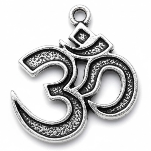El colgante representa la sílaba sagrada Om (Aum), un símbolo central en las tradiciones espirituales como el hinduismo, el budismo y el jainismo.