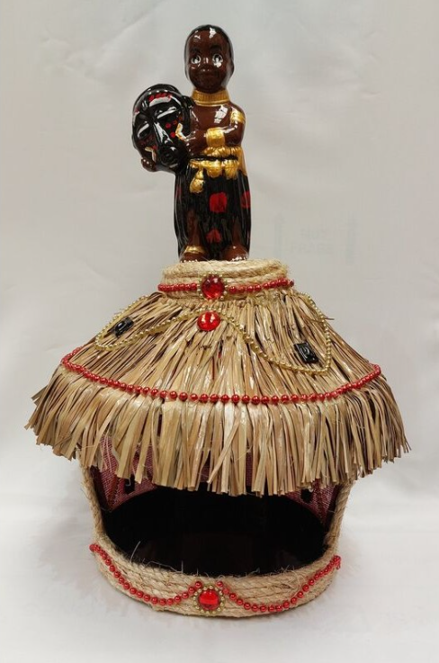 Esta casa de Elegguá (también conocida como «casa de Eshu» o «fundamento decorado») mide 32 cm de diámetro × 34 cm de alto y está artesanalmente decorada en el estilo Maribo (rico en detalles rojos, negros y dorados, típico de altares cubanos y yoruba). Es una pieza tradicional para colocar el fundamento de Elegguá en tu altar o entrada de la casa.