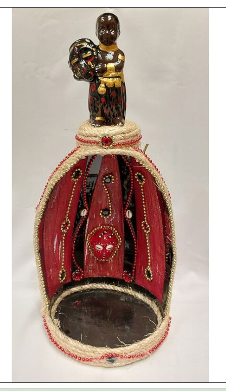 Esta hermosa casa de Elegguá (también llamada «casa de Eshu» o «fundamento decorado») mide 44 cm de alto × 28 cm de ancho y está artesanalmente decorada en estilo Maribo (con toques ricos en rojo, negro, oro y detalles brillantes). Es una pieza tradicional para colocar el fundamento de Elegguá en tu altar o espacio sagrado.