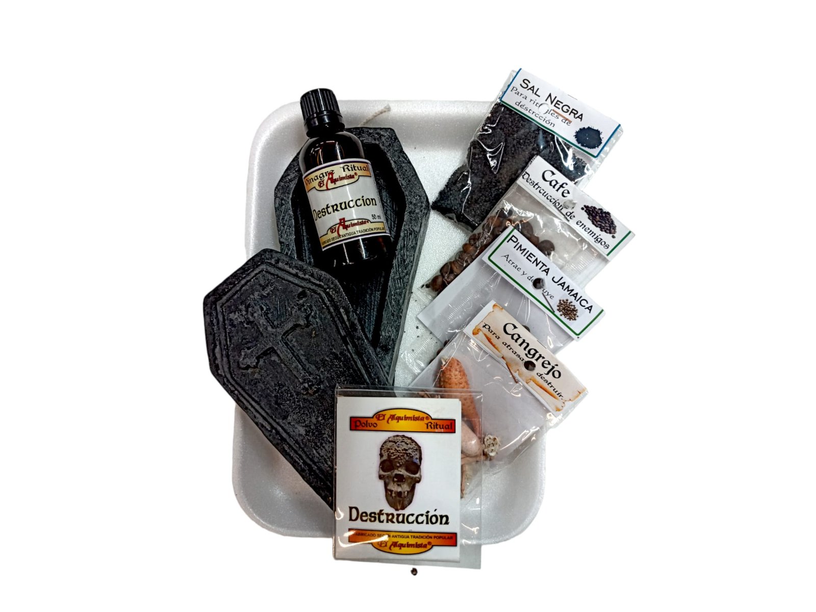 Este kit contiene elementos asociados con la Magia de Destierro y Destrucción (o Tumba Trabajos). Está diseñado para romper maleficios, brujerías, cortar lazos de enemigos o destruir la suerte y el camino de una persona.