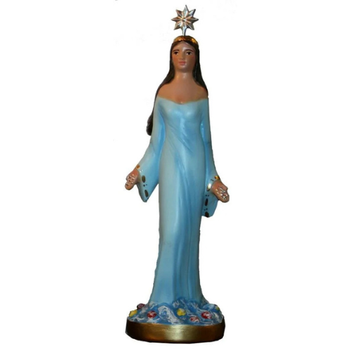 La Figura de Escayola de Yemayá representa a la poderosa Orisha del mar, madre de la vida y protectora de la familia y la maternidad en la santería y religiones afrocubanas. Es símbolo de protección, fertilidad, armonía familiar y prosperidad.
