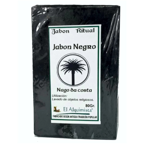 JABÓN NEGRO “Nago da Costa” – 80 g (El Alquimista) El auténtico jabón negro africano-cubano-brasileño, hecho con ceniza de palma, manteca de corojo y hierbas fuertes. Color negro intenso, olor penetrante y tradicional.