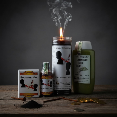 | Aceite / Esencia de Separación / Destierro | El Disolvente de la Unión. Aceite concentrado con esencias de enfriamiento o destierro. Se utiliza para ungir el velón, las fotos o los nombres de las personas, aplicando de la mecha hacia la base para simbolizar el alejamiento. |