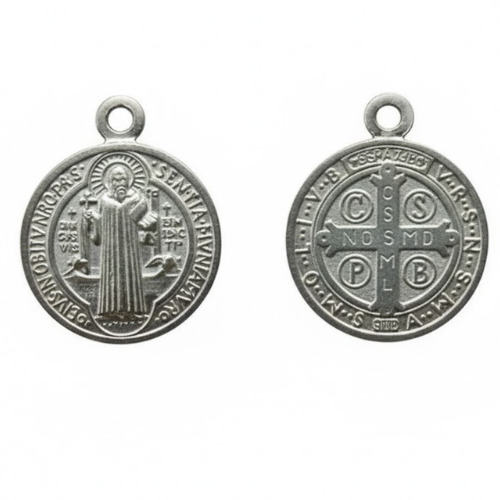Medalla de alpaca plateada (2 cm diámetro) con relieve detallado de San Benito Abad sosteniendo la cruz y el libro de la Regla. Grabadas las iniciales latinas clásicas: C S P B (Crux Sancti Patris Benedicti), C S S M L (Crux Sacra Sit Mihi Lux), N D S M D (Non Draco Sit Mihi Dux), V R S N S M V (Vade Retro Satana, Nunquam Suade Mihi Vana), S M Q L I V B (Sunt Mala Quae Libas, Ipse Venena Bibas). Incluye argolla para cadena o llavero. Bendecida con agua de San Benito y oración tradicional.