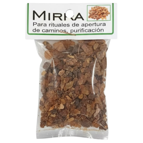 Mirra 100 % natural (Commiphora myrrha) procedente de Somalia y Etiopía, en trozos gruesos de color marrón-rojizo intenso con polvo característico. La misma que se usaba en el Antiguo Egipto, en la Biblia y en los templos de Jerusalén.