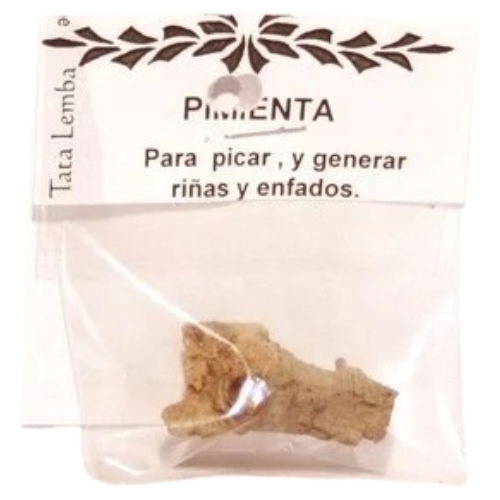 - 7 pedacitos de palo pimienta + 7 granos de pimienta negra + pólvora de petardo → en bolsita roja. Se lleva encima o se cuelga en la puerta para que todo lo malo se queme al intentar entrar.