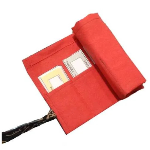 - Estuche de tela roja enrollable con 6 bolsillos