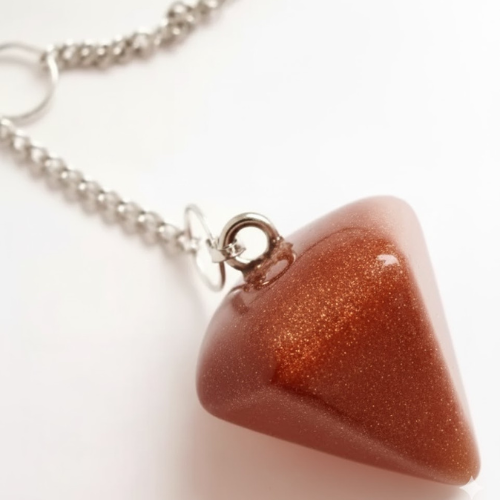 Forma cónica facetada de calcedonia natural (tono dorado-cobrizo con brillo suave y destellos internos) con cadena de metal plateado.