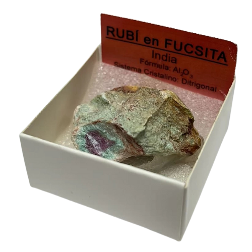 Espectacular muestra natural donde cristales de rubí rojo intenso aparecen incrustados en fucsita verde brillante (mica verde curativa). Procedente de las minas de Karnataka (India). Cada pieza es totalmente diferente y de calidad colección.