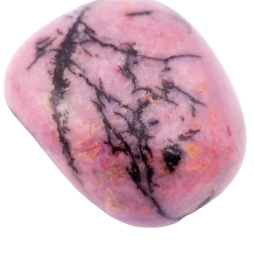Rodonita 100 % natural, rosa profundo con esas vetas negras tan características que parecen raíces o rayos. Rodada y pulida hasta quedar suave y perfecta para llevar en la mano, en el bolsillo o debajo de la almohada.