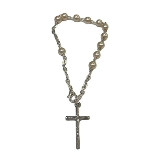 Esta pulsera se presenta en el tradicional formato de rosario, uniendo cuentas esféricas en un tono beige o crema, culminando con una cruz. Es una joya espiritual que fusiona la devoción clásica con un simbolismo de paz, tierra y neutralidad.