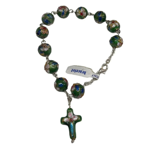 Pulsera rosario de 10 cuentas realizadas con la verdadera técnica cloisonné italiana: esmalte vitrificado sobre metal con delicados motivos florales en tonos rosa, blanco, rojo y verde sobre fondo azul intenso.