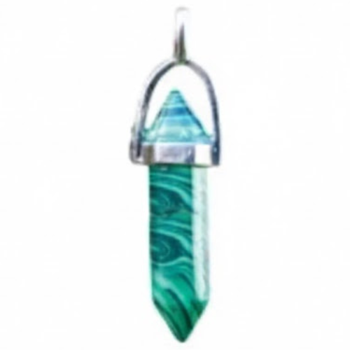 MALAQUITA PUNTA PARA COLGAR (Malaquita natural tallada en punta con engarce – verde intenso con bandas concéntricas y ojos característicos)