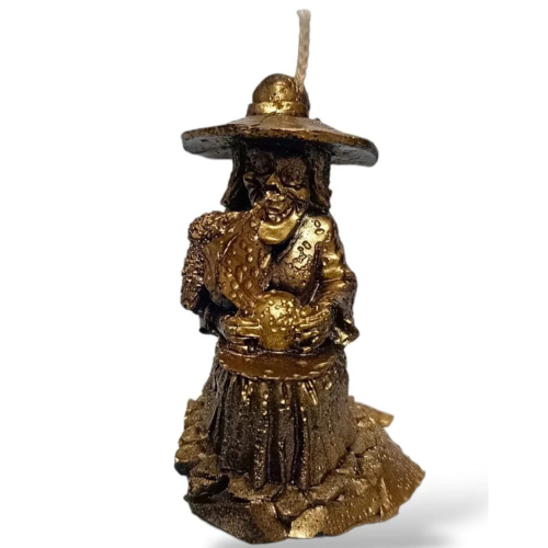 Vela decorativa tallada a mano con forma de bruja vidente sosteniendo una bola de cristal. Elaborada en parafina ecológica de alta calidad, en tono bronce-dorado con efecto metálico envejecido.
